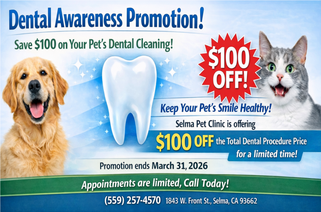Save $100 on your pet’s dental cleaning at Selma Pet Clinic—limited-time Dental Awareness Promotion. Appointments available now! Pre-Dental Exam & Blood Work Required First. Extractions & Medications Not Included