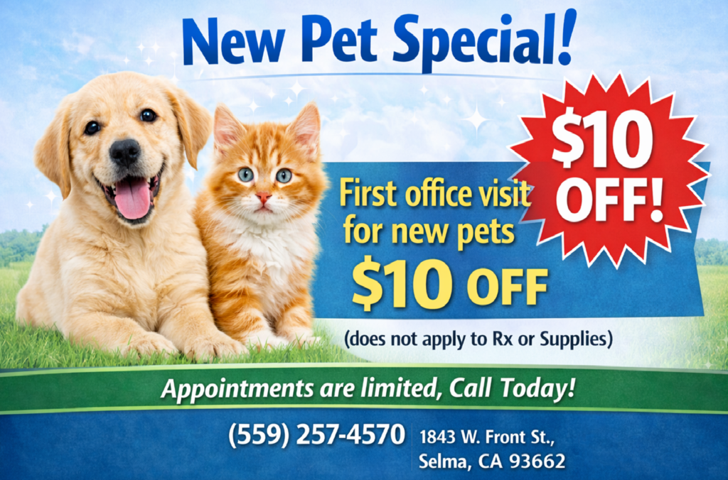 Welcome your new pet with their first office visit—get $10 off at Selma Pet Clinic. Offer excludes Rx and supplies.